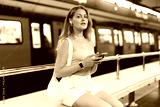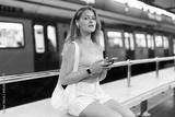 Young woman waiting for train at metro station with mobile phone in headphones