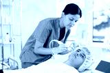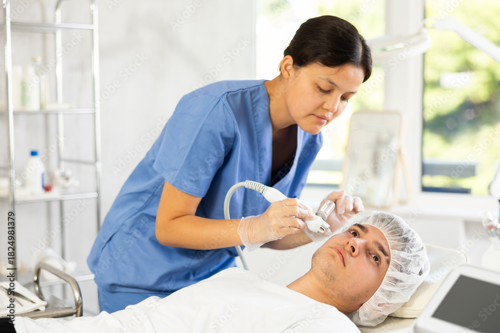 Client gazed into mirror, observing how female cosmetic doctor had rejuvenated his skin, and he felt youthful and confident in his appearance.