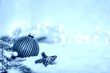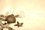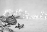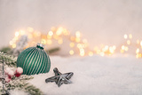 Elegant green Christmas bauble with silver glitter and ribbon lies on snow with pine branches, berries, and festive string lights in a soft holiday setting. Ideal for holiday greeting cards
