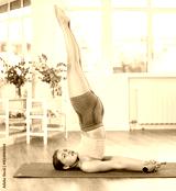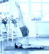 Young woman practicing hatha yoga asanas on mat in fitness studio