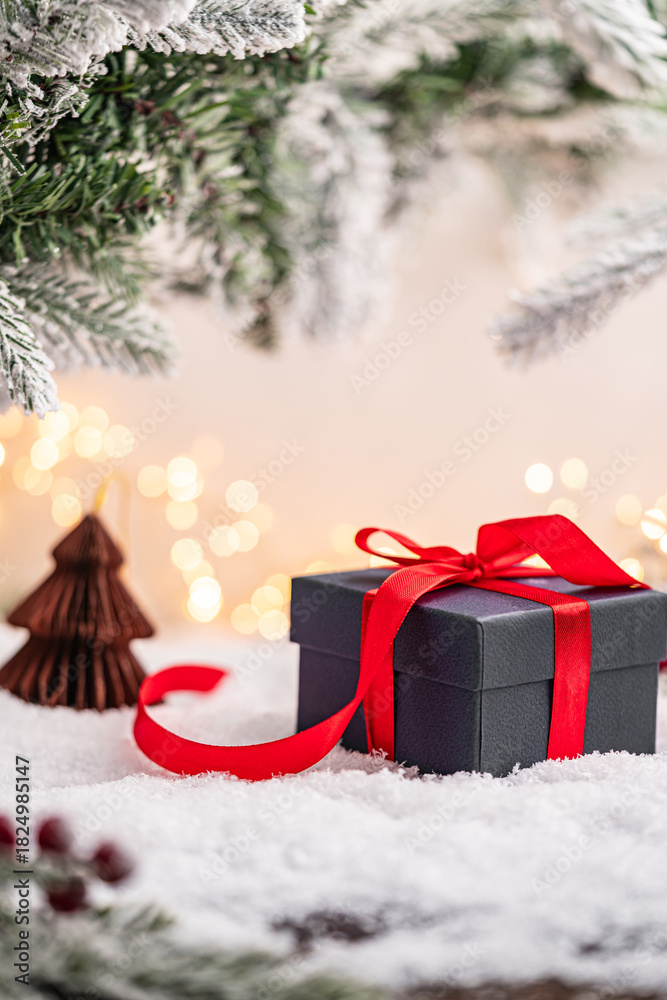 Elegant black present with a red ribbon sits on snow beneath frosted pine branches and festive holiday lights. Winter Christmas Holiday Decoration Background