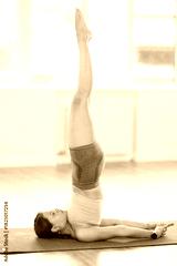 Sportive young girl practicing shoulderstand pose of yoga on blue mat in light room