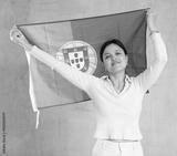Portrait of young smiling woman in casual clothes posing with flag of Portugal in studio