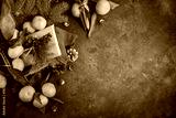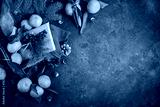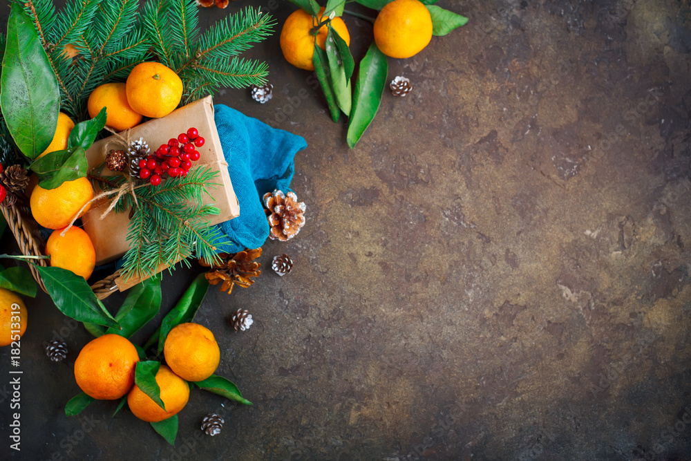 Christmas and New Year's composition with fresh tangerines, Happy New Year and Merry Christmas. Selective focus.