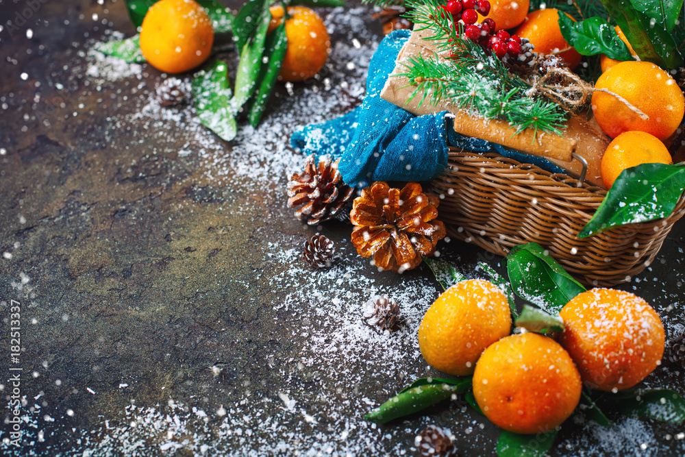 Christmas and New Year's composition with fresh tangerines, Happy New Year and Merry Christmas. Selective focus.