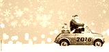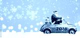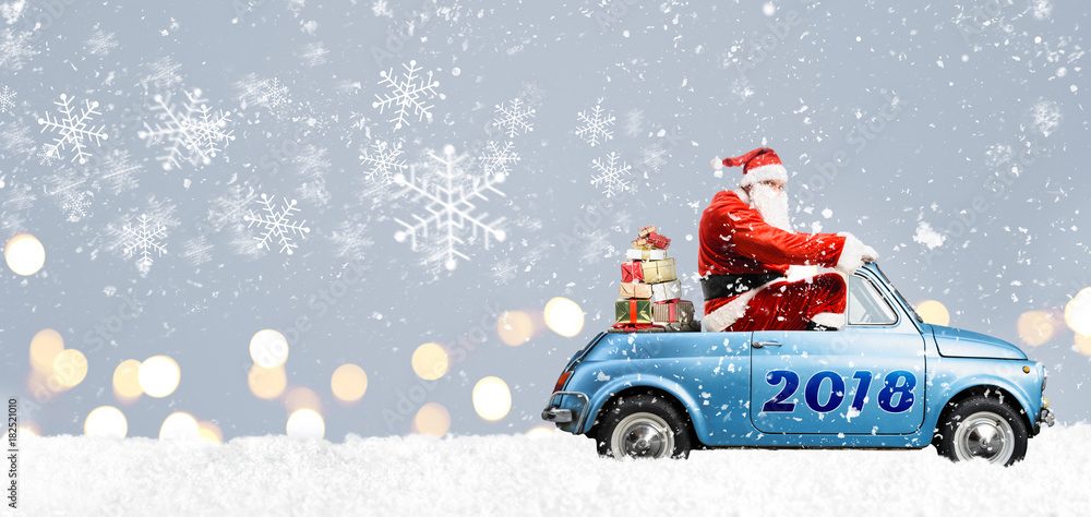 Santa Claus on scooter delivering Christmas or New Year gifts at snowy blue background