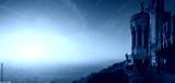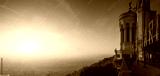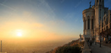 Panorama of Basilica Notre-Dame de Fourviere and Lyon during a foggy sunrise.
