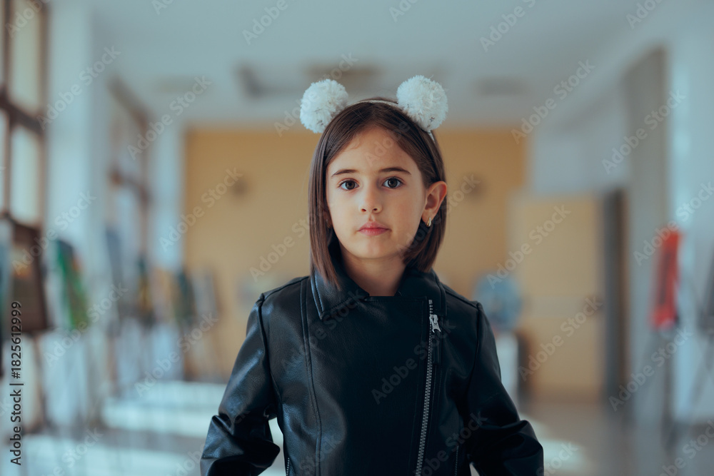 Little Girl in Leather Jacket Visiting an Art Gallery. Cool and fashion forward kid having a confident attitude
