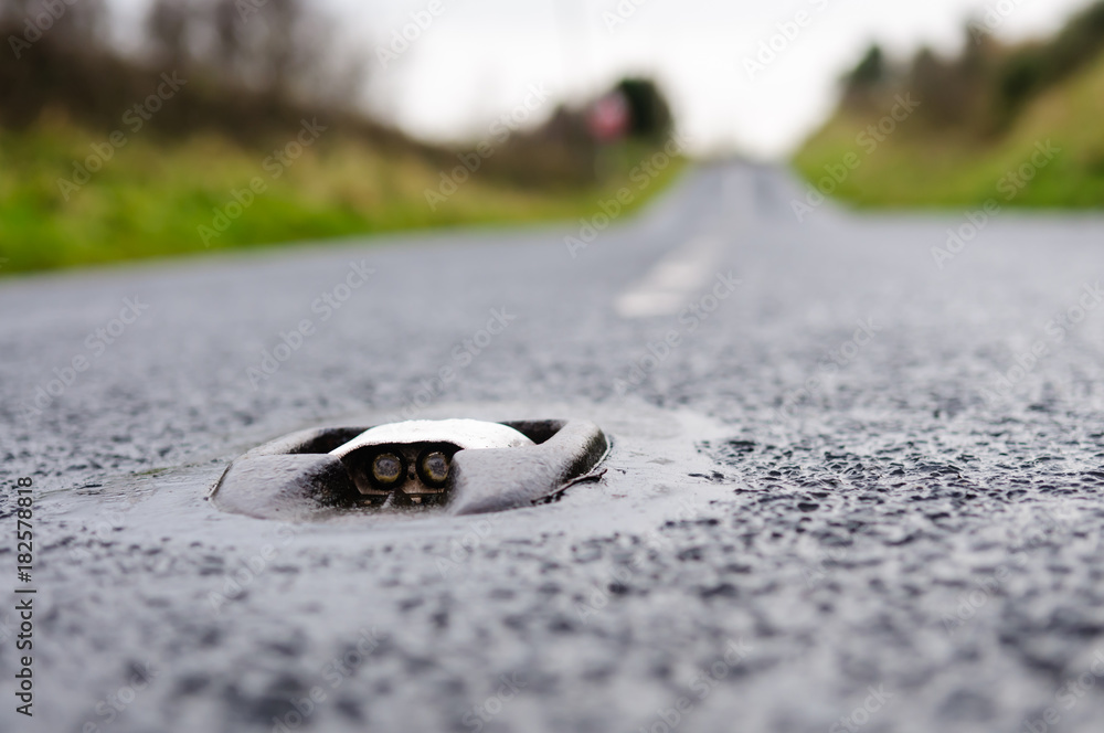 Catseye reflective road marking in the middle of a rural road.