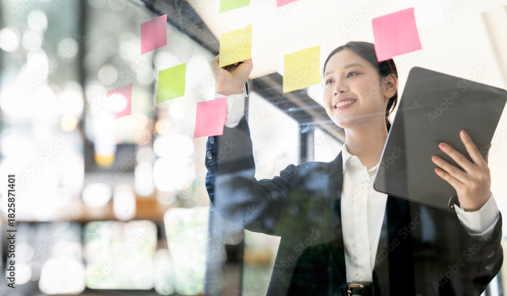 Smiling Asian businesswoman holding a tablet and attaching sticky notes to a glass wall, demonstrating organization, planning, and brainstorming in a modern office.