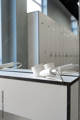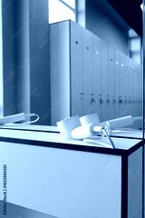 Lockers and equipment in a modern gym setting with a clean and bright atmosphere