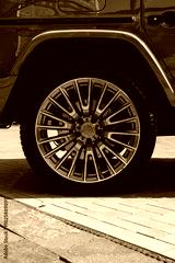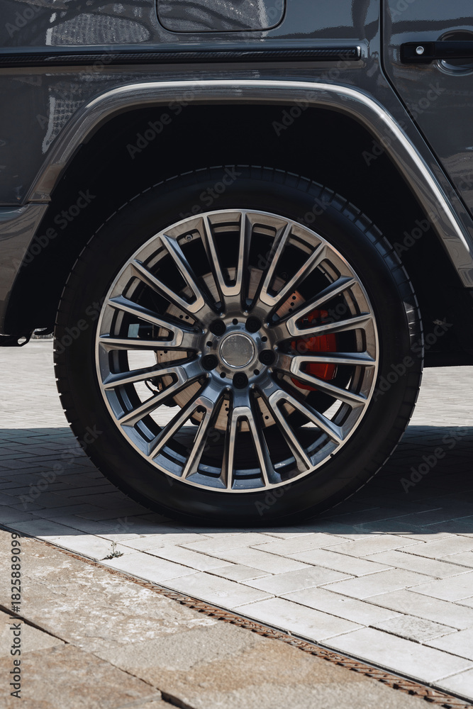 Close-up view of a luxury vehicle wheel on a modern pavement
