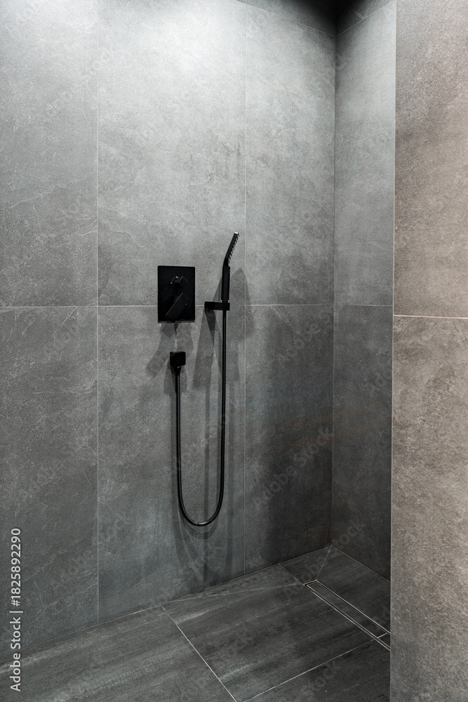 Modern black shower fixture in a stylish gray tiled bathroom space