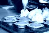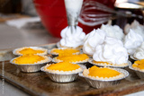 Piping swirled meringue onto lemon curd tarts on baking tray