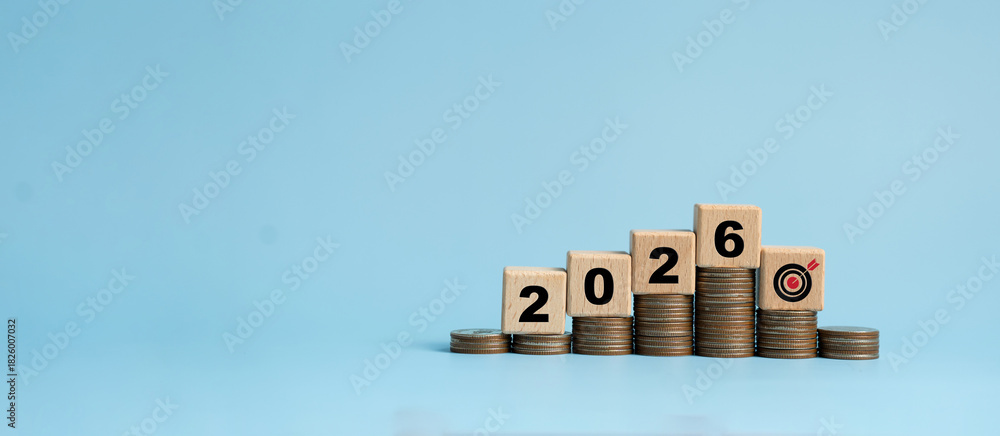 Wooden blocks showing 2026 placed on stacked coins for financial growth, investment planning, business goals and future success. Ideal for strategy, economy, savings and wealth management.