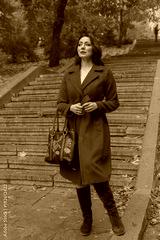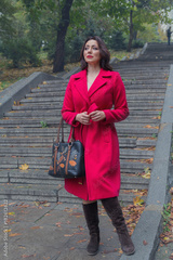Beautiful woman in a red coat on the stairs. People