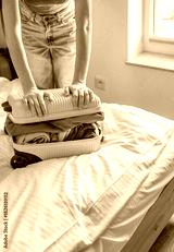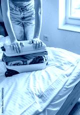 Person packing suitcase with colorful clothes on bed