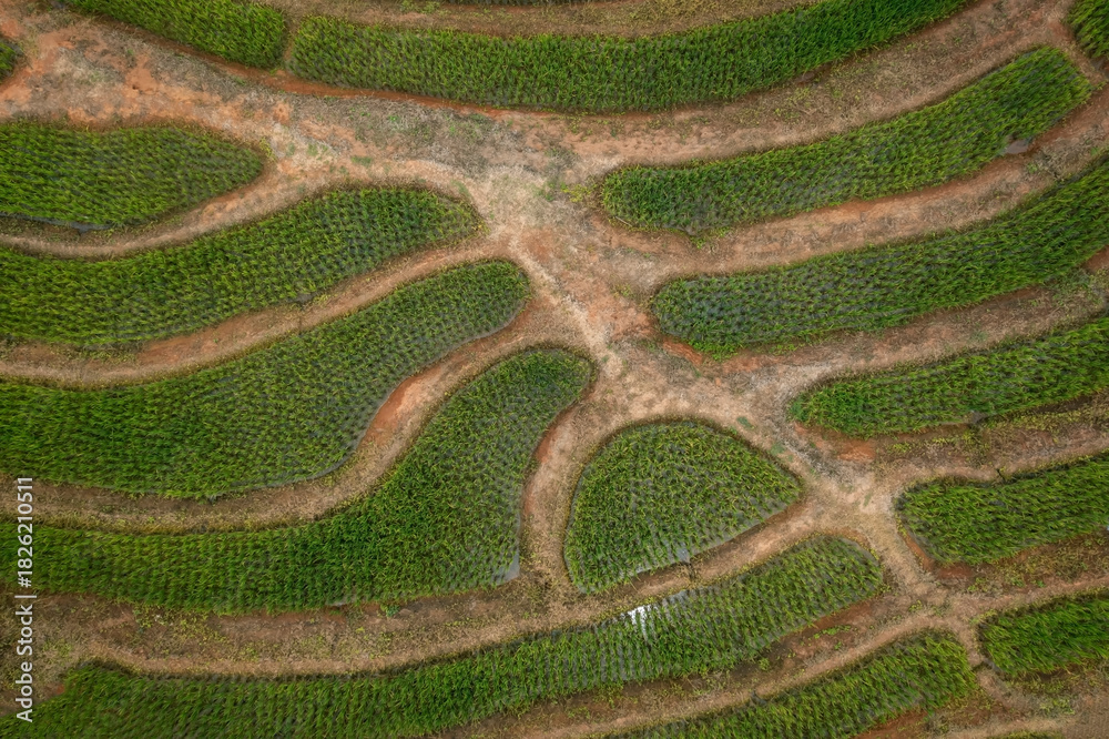 Aerial View of Rice Terraces and Green Paddy Field Patterns