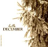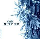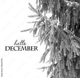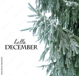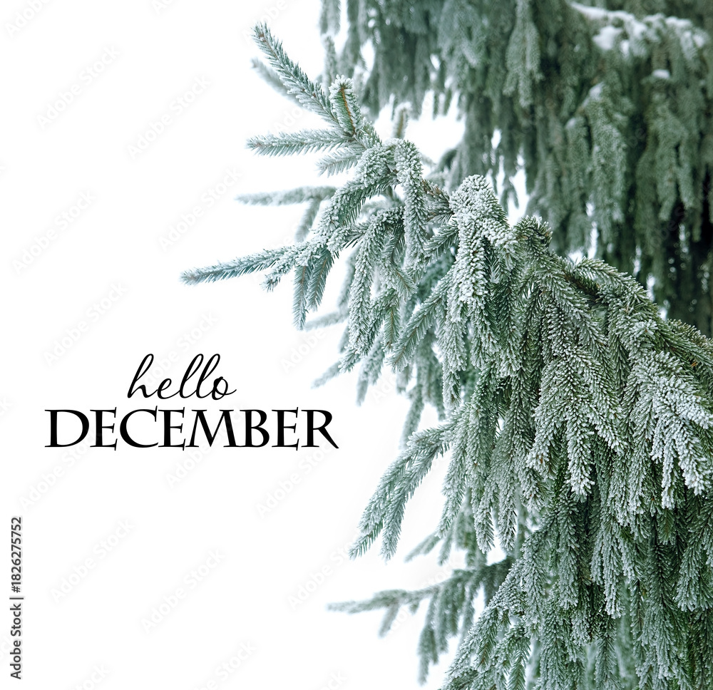 Hello December greeting card. snowy fir tree on white backdrop. beautiful winter nature background. rime covered needles fir tree branches. december month calendar, winter beginning concept.