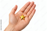 Human hand holding a single golden star shape on open palm isolated on white background for success and achievement concept