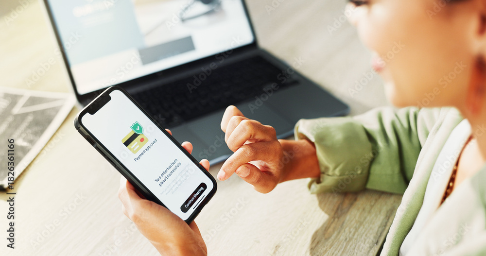 Online shopping, laptop or hands with phone screen for payment, digital purchase or successful transaction. Ecommerce, banking approval or woman with fintech from high angle or customer experience