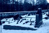 Snowy cemetery scene with old stone wall, cross, and metal gate, set against backdrop bare trees and cold blue sky, evoking peace, memory, and quiet beauty of winter