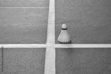 Cream white badminton shuttlecocks on floor in indoor badminton court, copy space, soft and selective focus on shuttlecocks.