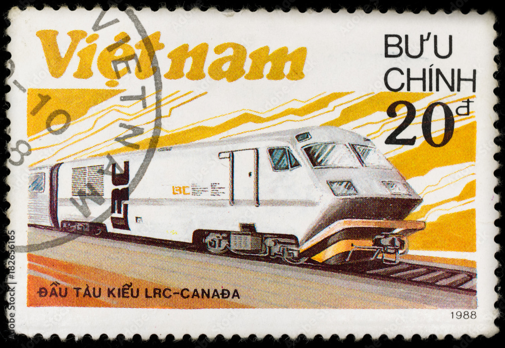 Old vintage postage stamp with canadian locomotive and railway, printed in Vietnam in 1988