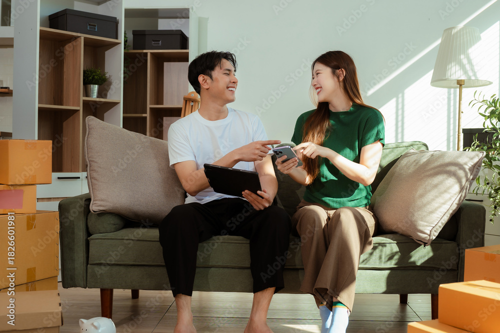 Young couple relaxing sitting on the sofa using the computer laptop around cardboard boxes, very happy moving to a new house.