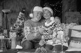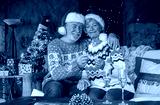 Happy older couple in festive sweaters toasting with sparklers enjoying a cozy Christmas moment together sitting on sofa with holiday lights, wrapped gifts, and Christmas tree.