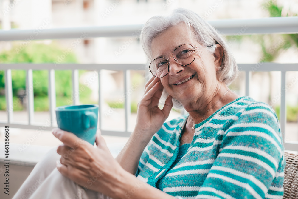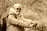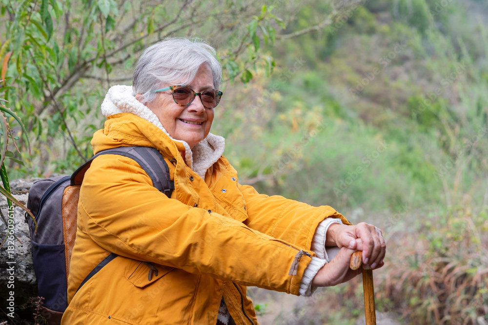 Smiling active senior woman walking outdoor on mountain excursion wearing yellow jacket and backpack. Relaxed elderly woman enjoying freedom and nature