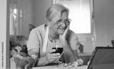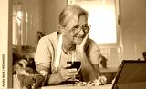 Elderly woman wearing apron using digital tablet while enjoying a red wineglass after chops fresh broccoli on a kitchen counter. Concept of healthy meal preparation, fresh vegetables, home cooking