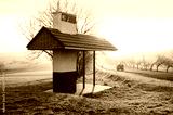 Rural bus stop at sunrise on a frosty morning. Quiet countryside road, soft golden light and peaceful village landscape.