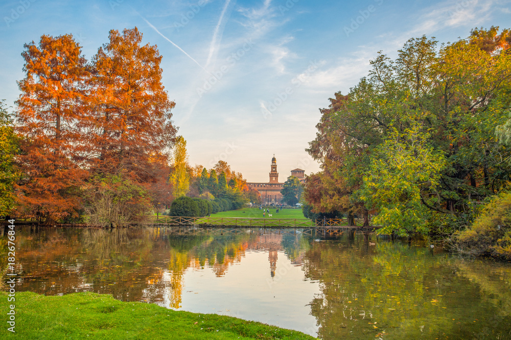 Sforza Castle (Castello Sforzesco), view from Parco Sempione, (Sempione Park), in Milan, Italy.