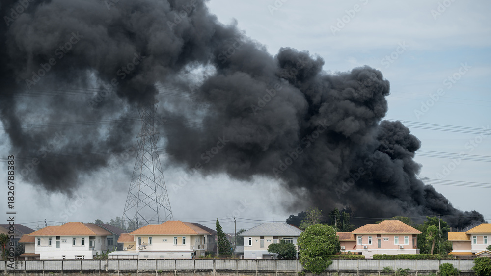 Dramatic scene of thick black smoke billowing over a residential neighborhood