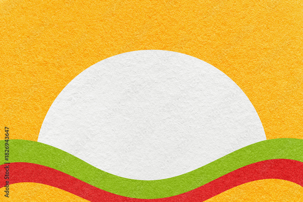 Yellow textured paper background with white circle for copy space and red, green waves for poster, banner, presentation