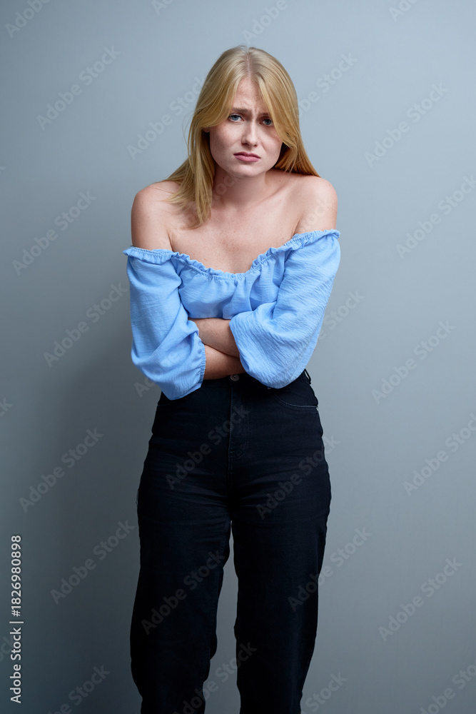 Young Woman With Sad Expression Wearing Blue Blouse in Minimalist Background
