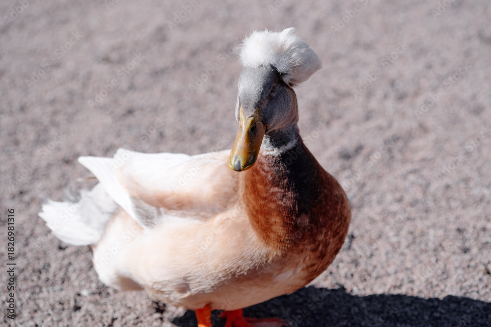 Close-up view of a charming duck with a unique crested head, standing on a gravel surface outdoors, showcasing its natural beauty and unique plumage.