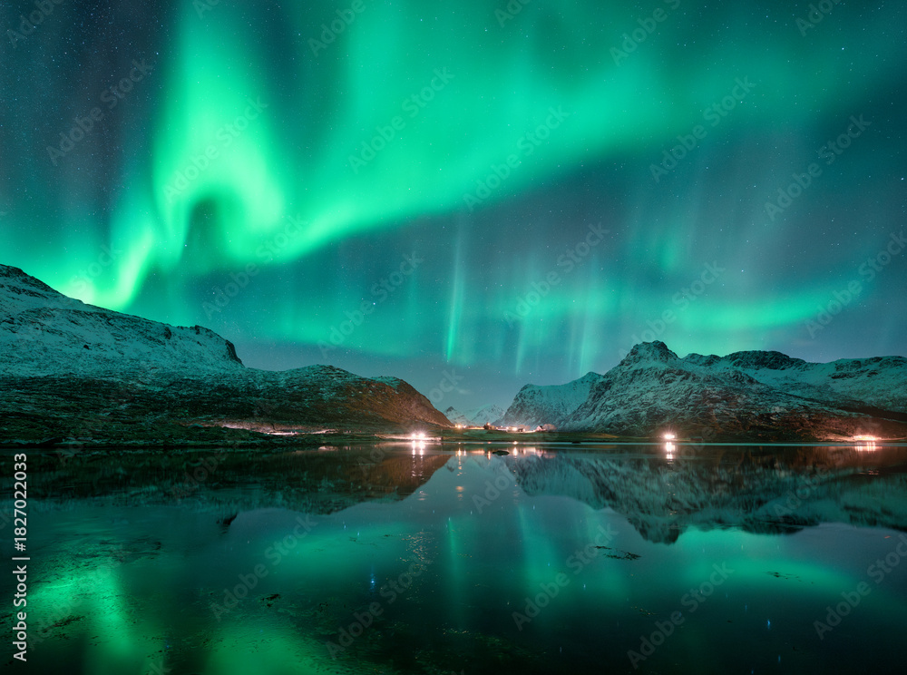 Aurora borealis over snowy mountains and calm reflective lake. Bright green Northern lights illuminate the winter landscape at night with clear sky in Lofoten Islands, Norway. Landscape with Aurora