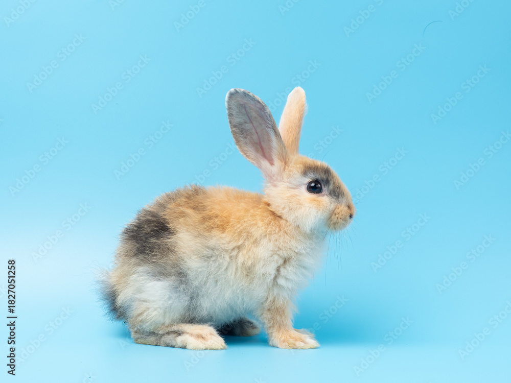 Adorable baby rabbit with calico or tortoiseshell fur colors: brown, gray, and cream. Cute pet portrait on a bright light blue studio background. Ideal for spring and animal themes.