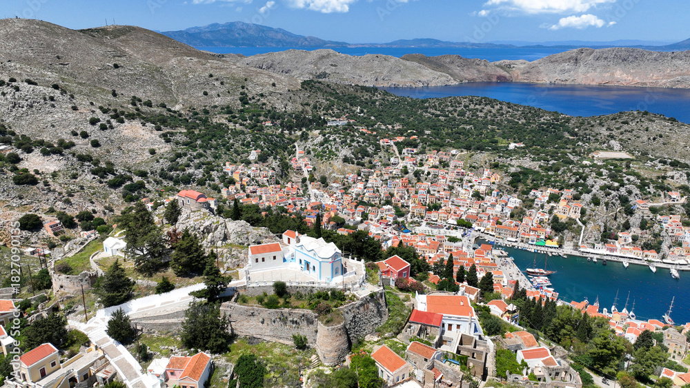 Aerial drone photo of iconic castle of Symi island built uphill overlooking main town and Yalos, Dodecanese, Greece