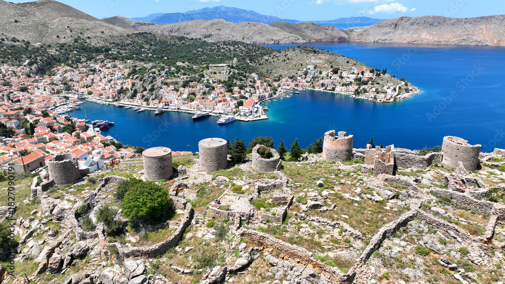Aerial drone photo of picturesque old windmills in Ano Symi overlooking main town and Yalos, Symi island, Dodecanese, Greece