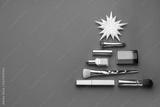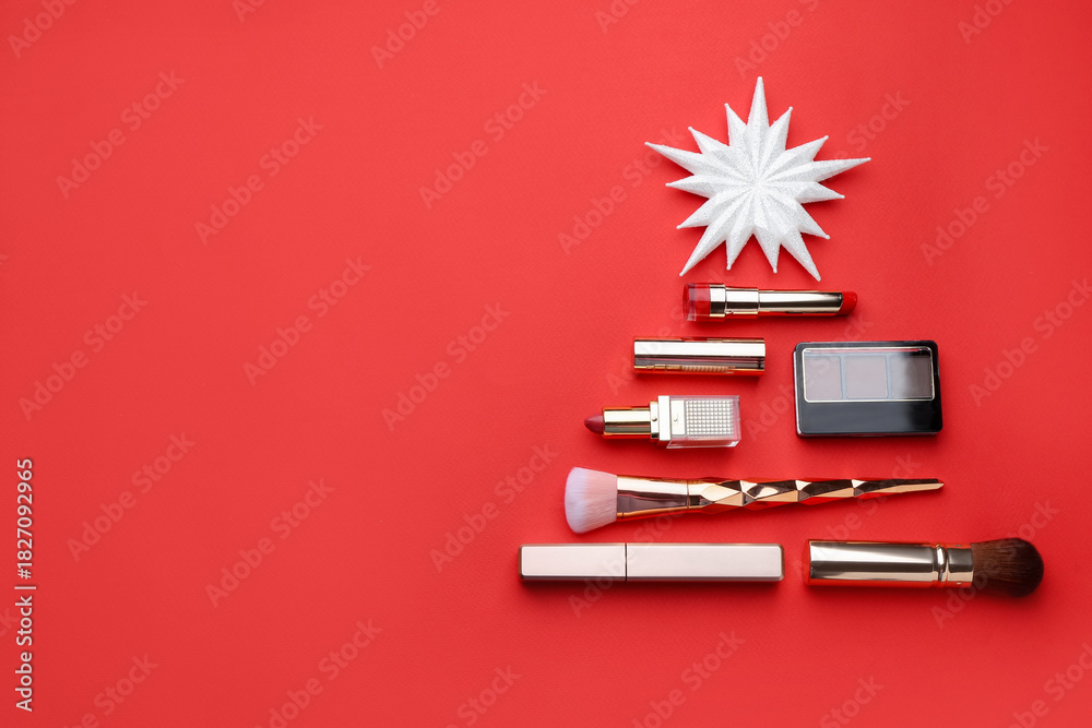 Christmas tree made with makeup products and brushes on red background, flat lay. Space for text