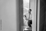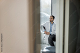 Young dentist wearing lab coat sitting in dental office looking to side, appearing thoughtful, modern clinic environment visible through partially open door