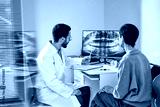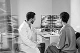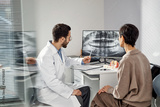 Young male dentist explaining dental x ray results to middle aged Caucasian woman patient in dental office, dentist using pen to indicate details on monitor, patient listening attentively