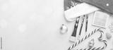 Christmas banner with makeup products, Santa hat and festive balls on pink background, flat lay
