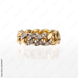 18kt yellow gold chain ring with brilliant-cut diamonds, photographed on a white background with reflection