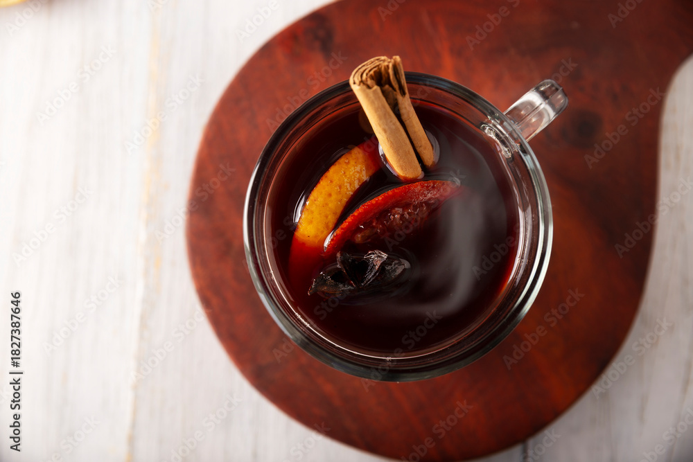 Hot wine or Christmas mulled wine with orange, cinnamon, star anise, clove, nutmeg and other ingredients on a wooden rustic table. Traditional hot drink at winter time and Christmas holidays.