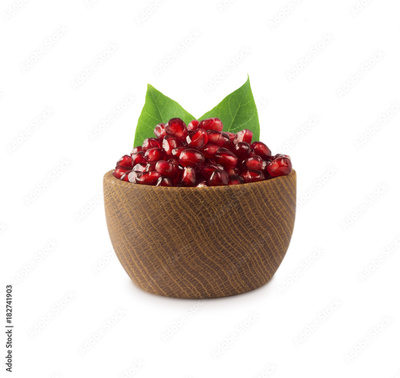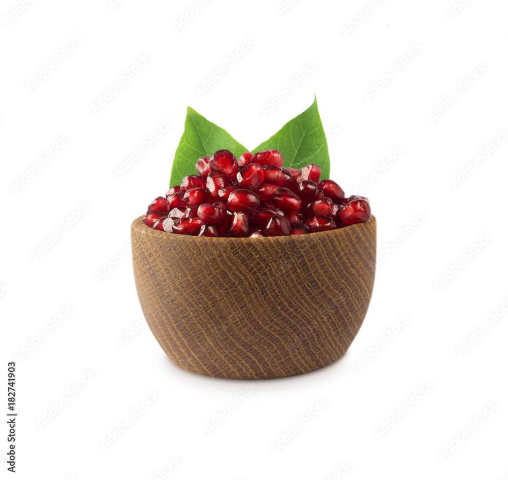 bowl with pomegranate seeds isolated on white background. Ripe pomegranates close-up. Sweet and juicy garnet with copy space for text.