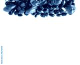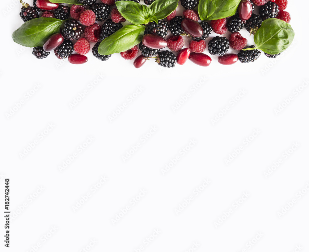 Black-blue and red berries isolated on white. Ripe blackberries, blueberries, raspberries, cornels and basil leaves on white background. Berries with copy space for text. Top view.